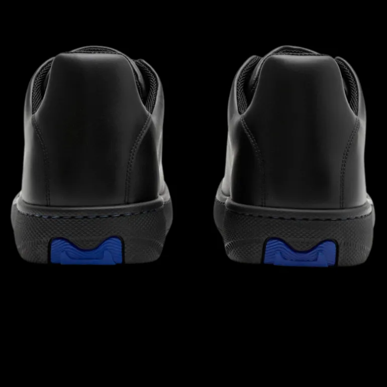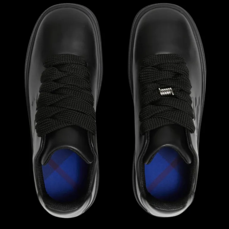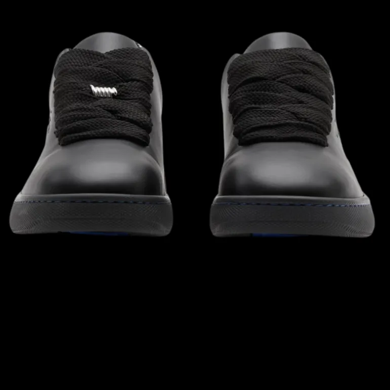 Baskets de fabrication italienne en cuir de veau lisse embossé du motif Equestrian Knight. Le style doublé en maille présente des fers barbelés au niveau des lacets et des semelles en caoutchouc moulées avec le lettrage Burberry d’archive.