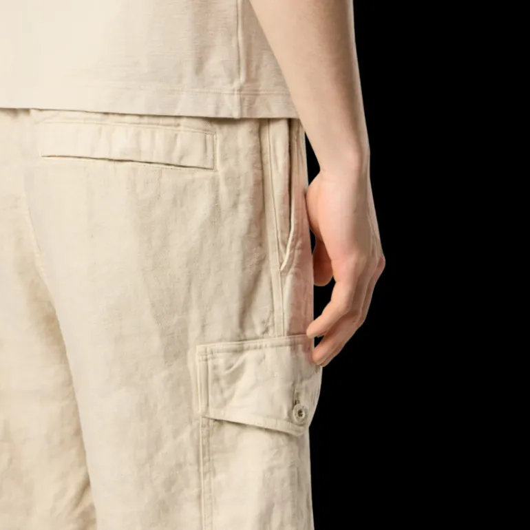 Les pièces Ghost, dérivées du concept de camouflage, sont totalement monochromes. Même le badge Stone Island est créé dans une version monochrome spéciale pour se fondre dans le vêtement. Bermuda cargo en lin diagonal. Modèle teint en pièce.