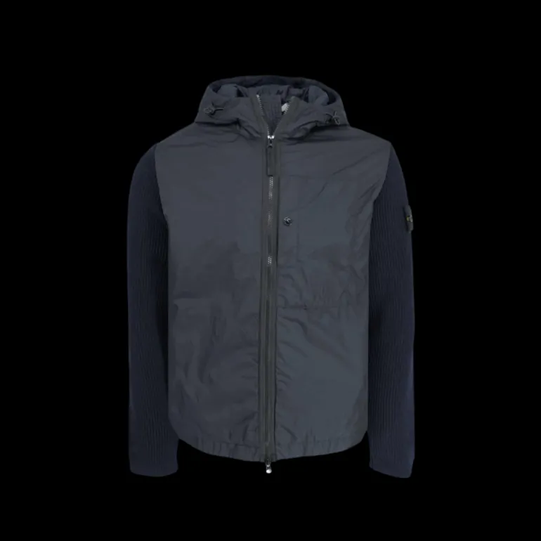 Capuche avec cordon de serrage sur le côté. Une poche poitrine droite avec fermeture à bouton-pression. Poches passepoilées avec fermeture zippée. Manches et dos en maille de pure laine côtelée. Écusson Stone Island sur la manche gauche. Fermeture zippée à double curseur.