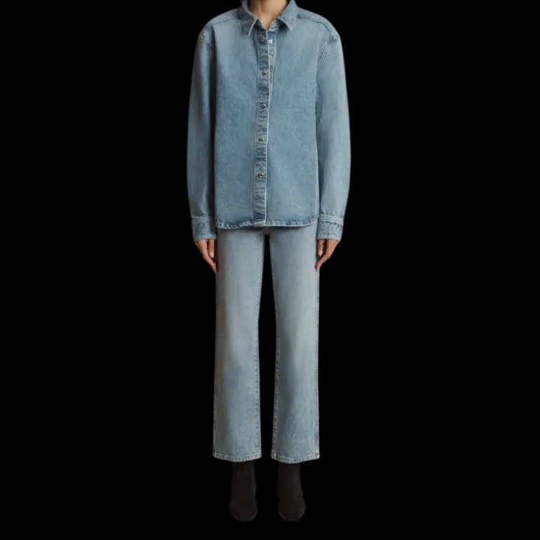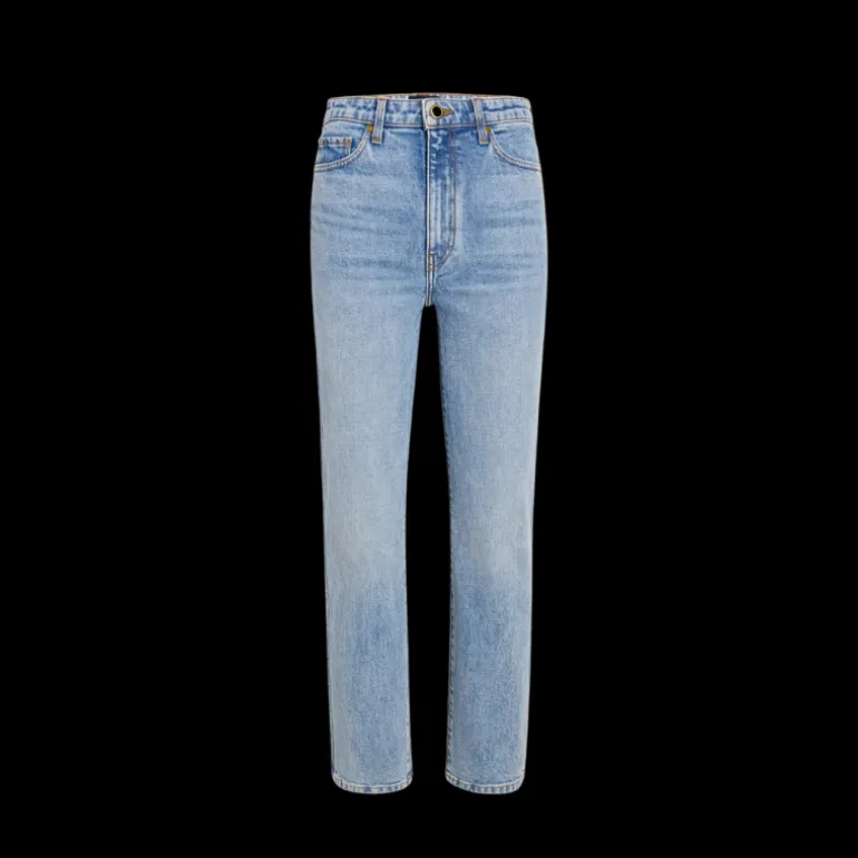 Une longueur courte équilibre une taille haute, créant des proportions fraîches et flatteuses avec un style classique de jambe droite et une finition à la main.