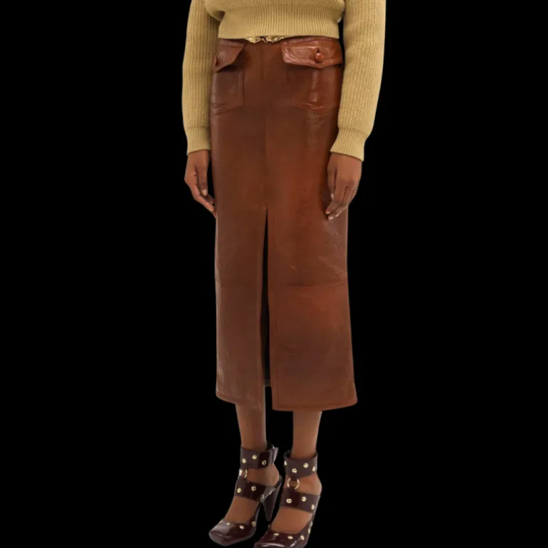 Jupe midi militaire fendue en cuir d’agneau brillant, avec détails de poches à rabat