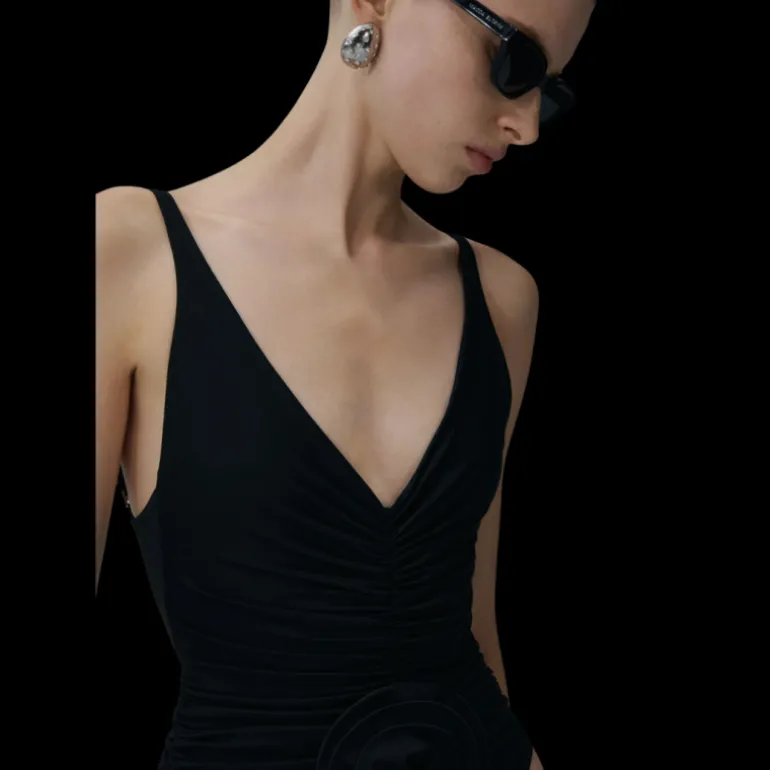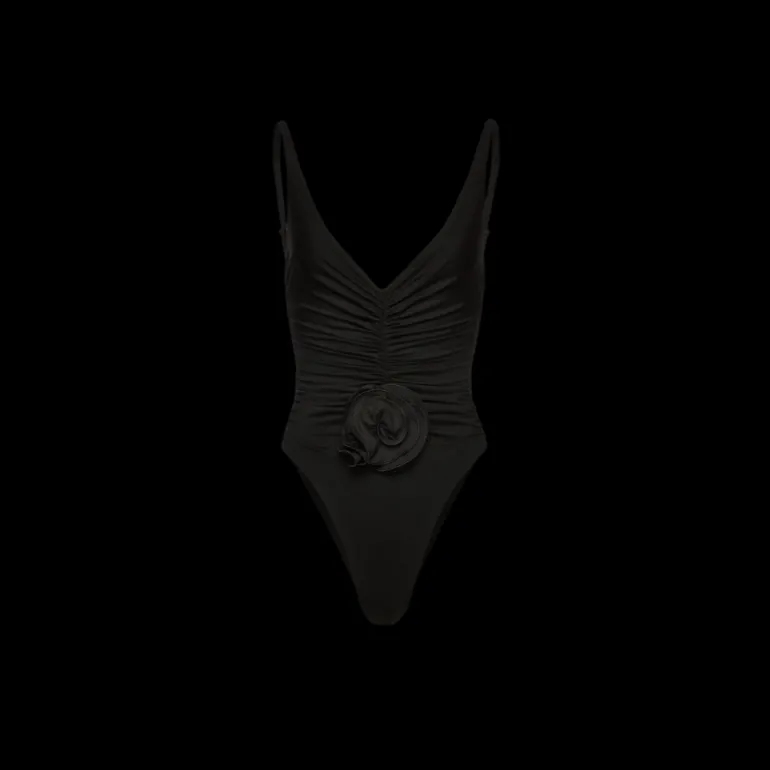 Maillot de bain une pièce avec décolleté en V et fronces sur tout le corps. Accentué par une fleur fixe sur le devant. Fabriqué à partir de tissus italiens.