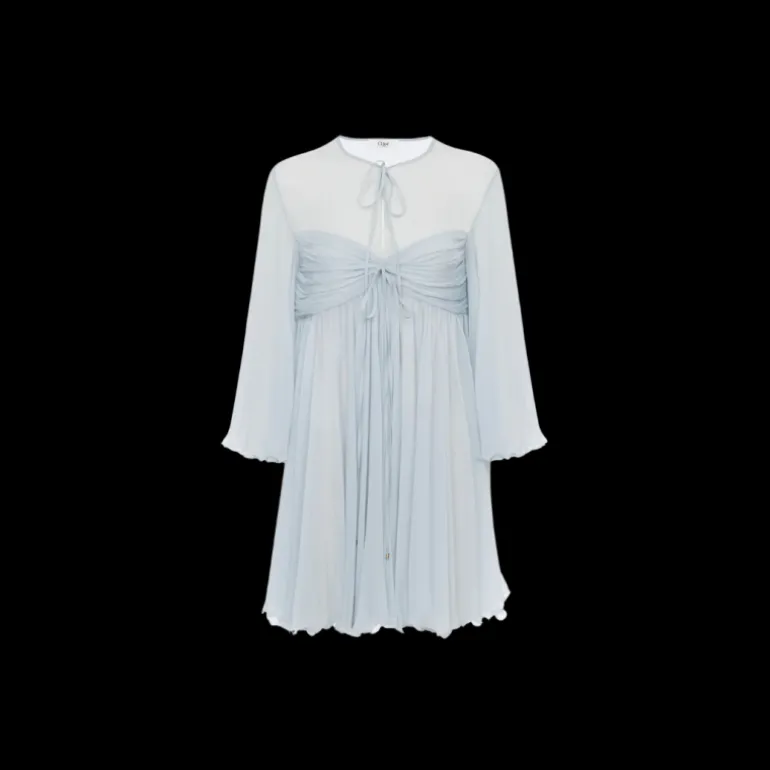 Mini robe plissée mousseline soie bleu ciel fronces liens
