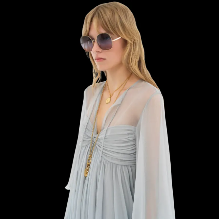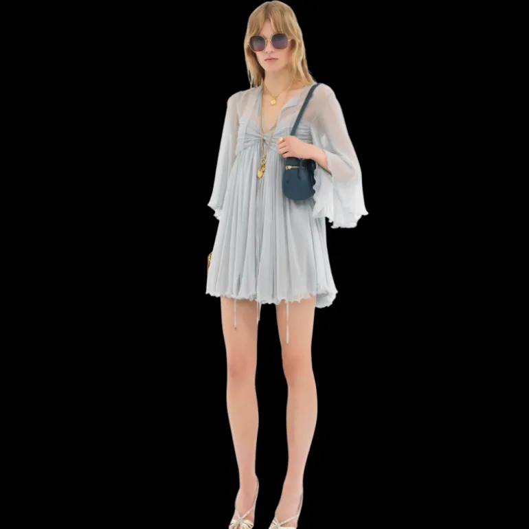 Mini robe plissée fluide en mousseline de soie transparente avec doublure en soie mélangée, agrémentée de fronces délicates et de liens avec embouts en métal.