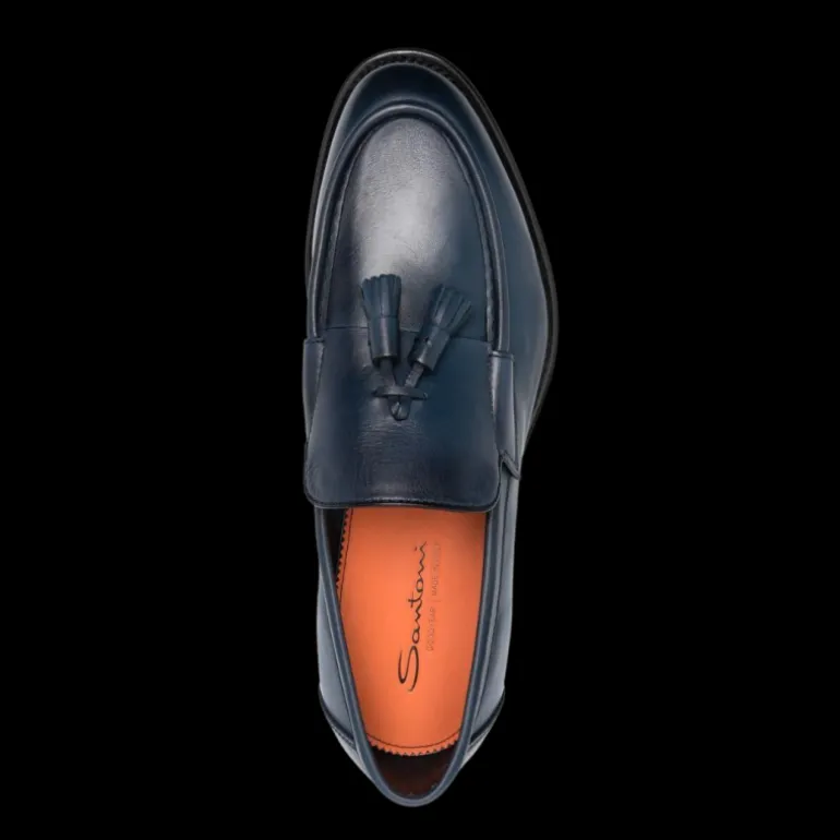 Mocassins cuir bleu marine avec glands bordure tresse