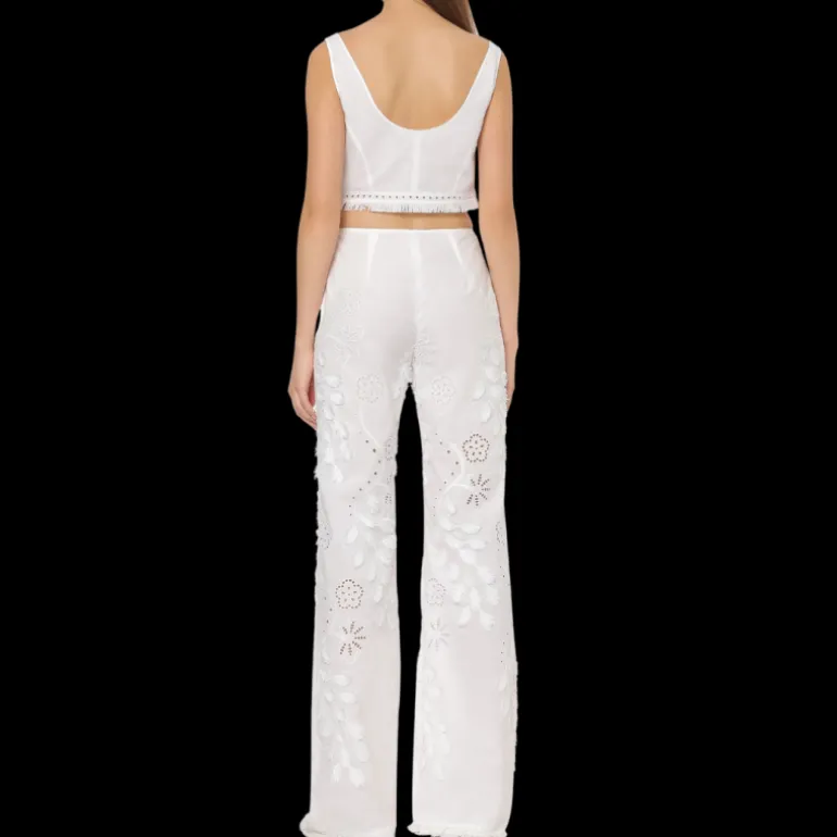 Pantalon Sangallo coton blanc broderie fleurs franges