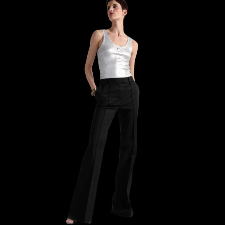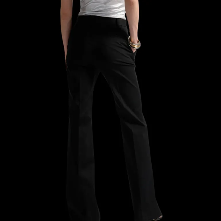 Réalisé dans une toile de coton stretch sable ou noir, ce pantalon femme bootleg allonge élégamment la jambe grâce à sa coupe et ses plis marqués le long de la jambe. Ses poches italiennes sont dotées d’un rabat en entrée de poche, un élégant trompe-l’oeil qui s’accorde parfaitement avec les détails de la veste 3 poches confectionnée dans la même toile de coton.