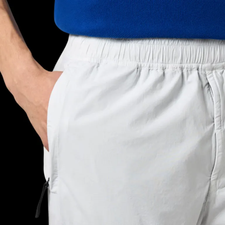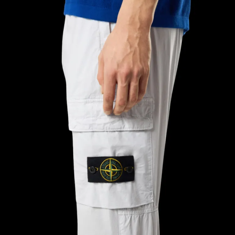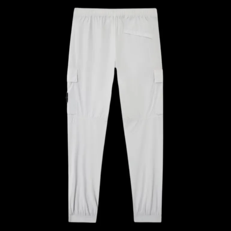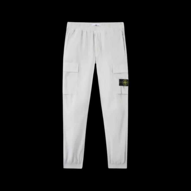 Poches repose-mains droites avec fermeture à glissière dissimulée. Une poche arrière fendue avec fermeture à pression dissimulée. Poche à soufflet sur les jambes avec rabat et fermeture à pression dissimulée ; la poche gauche arbore le badge Stone Island. Bande élastique sur le bas des jambes. Ceinture élastiquée avec cordon de serrage intérieur. Braguette zippée. Coupe fuselée classique.