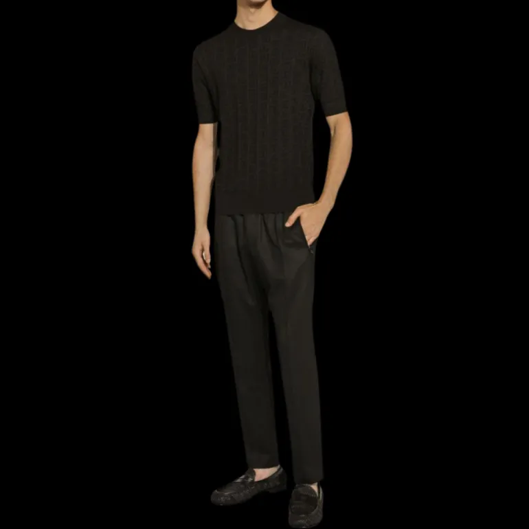 gris roche sicilien enveloppe différentes textures, tandis que le noir Nero Sicilia orne les tissages textiles et velours et le camel se marie à l’orange. Différents types de rayures fines, de cachemire à effet texturé, de tissus doubles, de daim et de denim se rencontrent dans les looks.