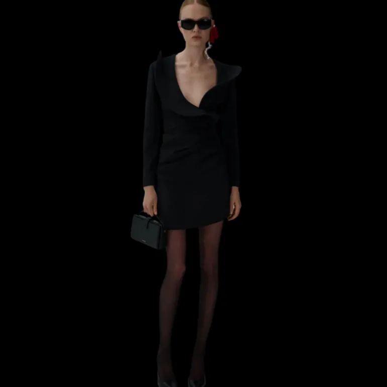 Confectionnée dans un mélange de laine stretch conçu pour épouser parfaitement toutes les courbes, cette mini-robe à manches longues est dotée d’un décolleté en V bas bordé d’un volant sculptural en 3D inspiré d’un pétale de rose. La jupe est finie avec des fronces au niveau des hanches.