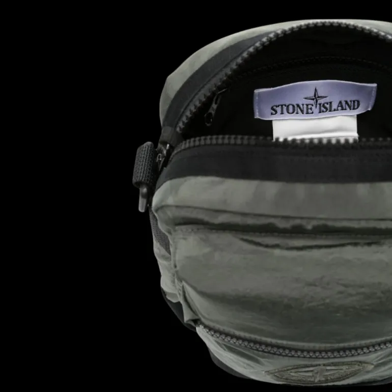 Poche à soufflet sur le devant avec fermeture zippée, arborant le logo Rose des Vents Stone Island brodé. Compartiment principal avec poche intérieure zippée. À l’arrière, une bande horizontale en nylon noir présente une inscription Stone Island brodée. Partie inférieure en toile Cordura® résistante. Toile de nylon doublée. À l’arrière, boucle en nylon réglable avec bandes en nylon.