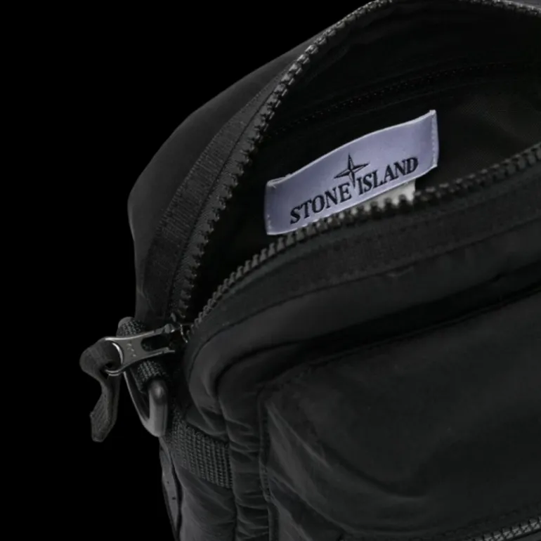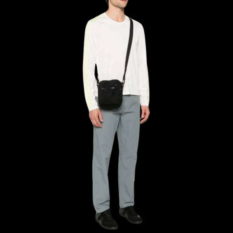Poche à soufflet sur le devant avec fermeture zippée, arborant le logo Rose des Vents Stone Island brodé. Compartiment principal avec poche intérieure zippée. À l’arrière, une bande horizontale en nylon noir présente une inscription Stone Island brodée. Partie inférieure en toile Cordura® résistante. Toile de nylon doublée. À l’arrière, boucle en nylon réglable avec bandes en nylon.