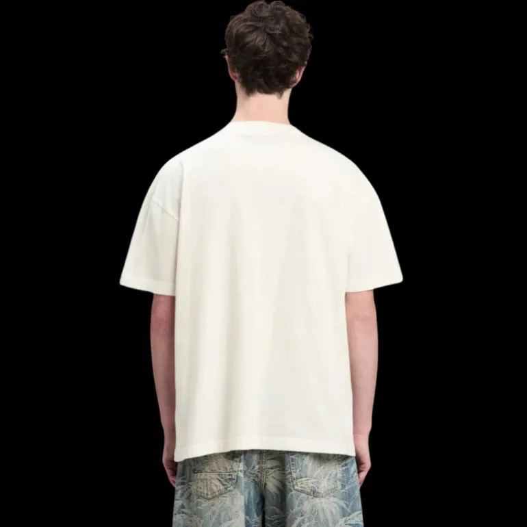 logo augmenté d’un nouveau positionnement et d’un effet de peinture frais. t-shirt blanc à manches courtes pour homme avec logo imprimé à la main en noir autour du cou.