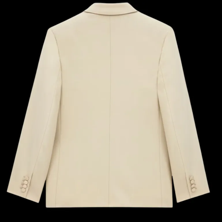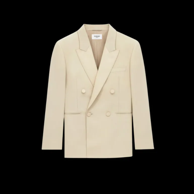 Veste de smoking à double boutonnage en laine certifiée, munie de quatre boutons recouverts de satin, de bordures surpiquées et d’un revers en pointe en satin.
